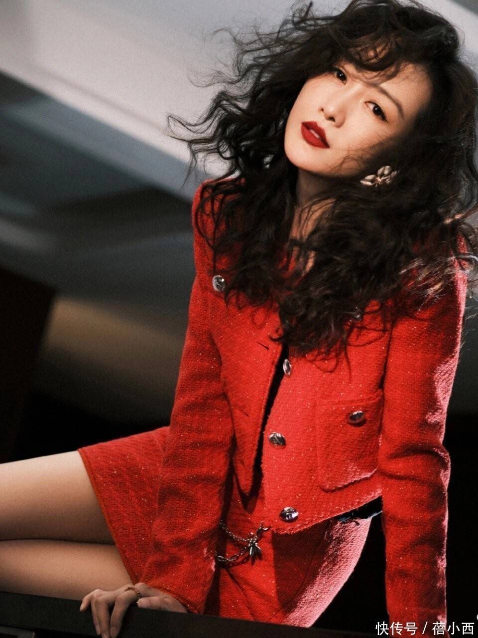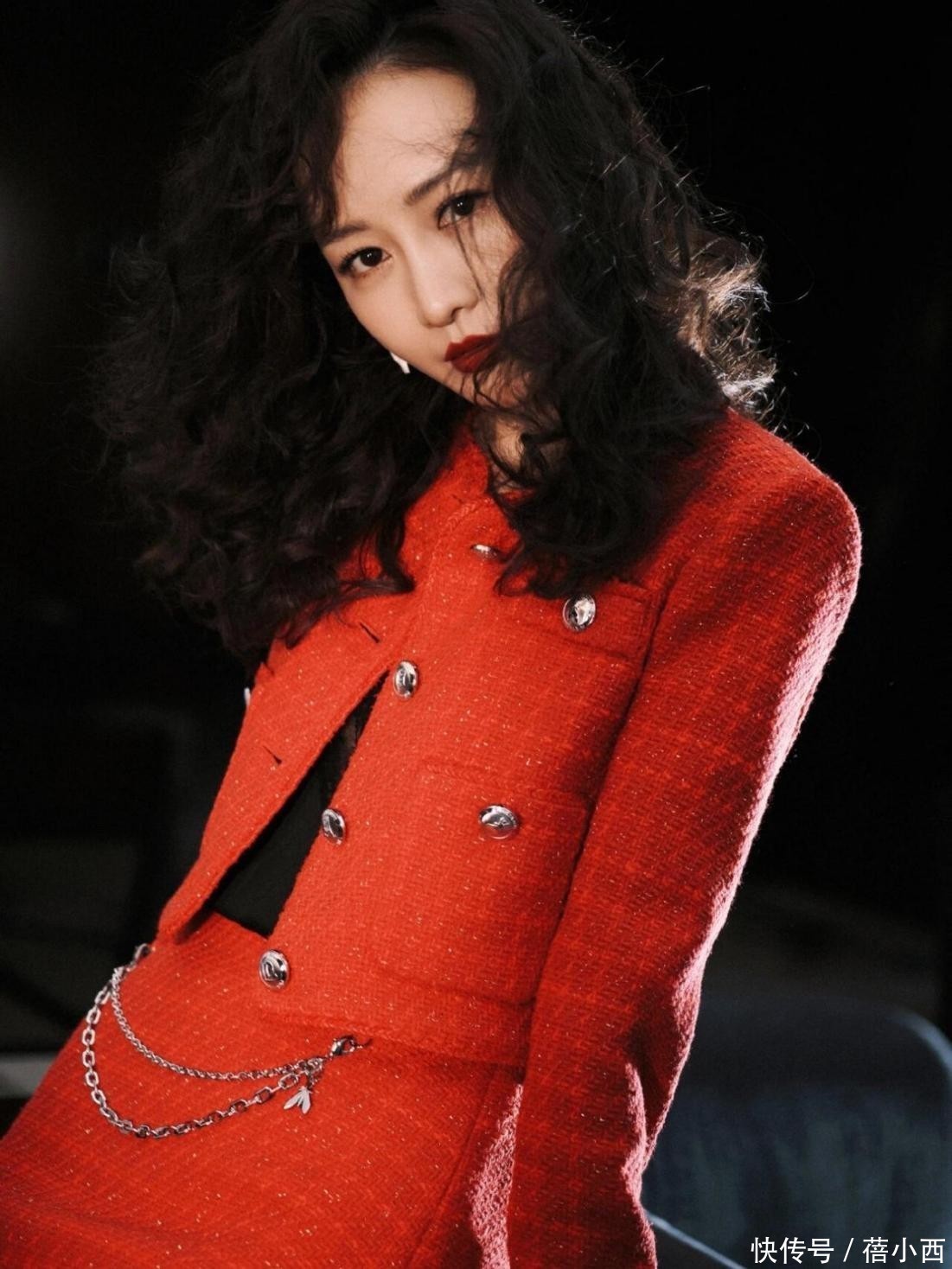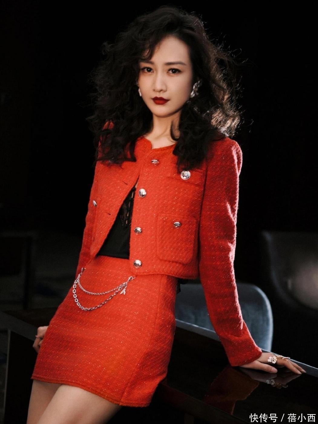 短裙与小开衫是套装,最吸人眼球的是半裙加入了链条设计,让优雅的氛围中多了些许接头感。裙子短的话,难免会影响一些行为,不想当淑女都难啊。这身红色穿搭挺适合春天,光腿神器该用则用。